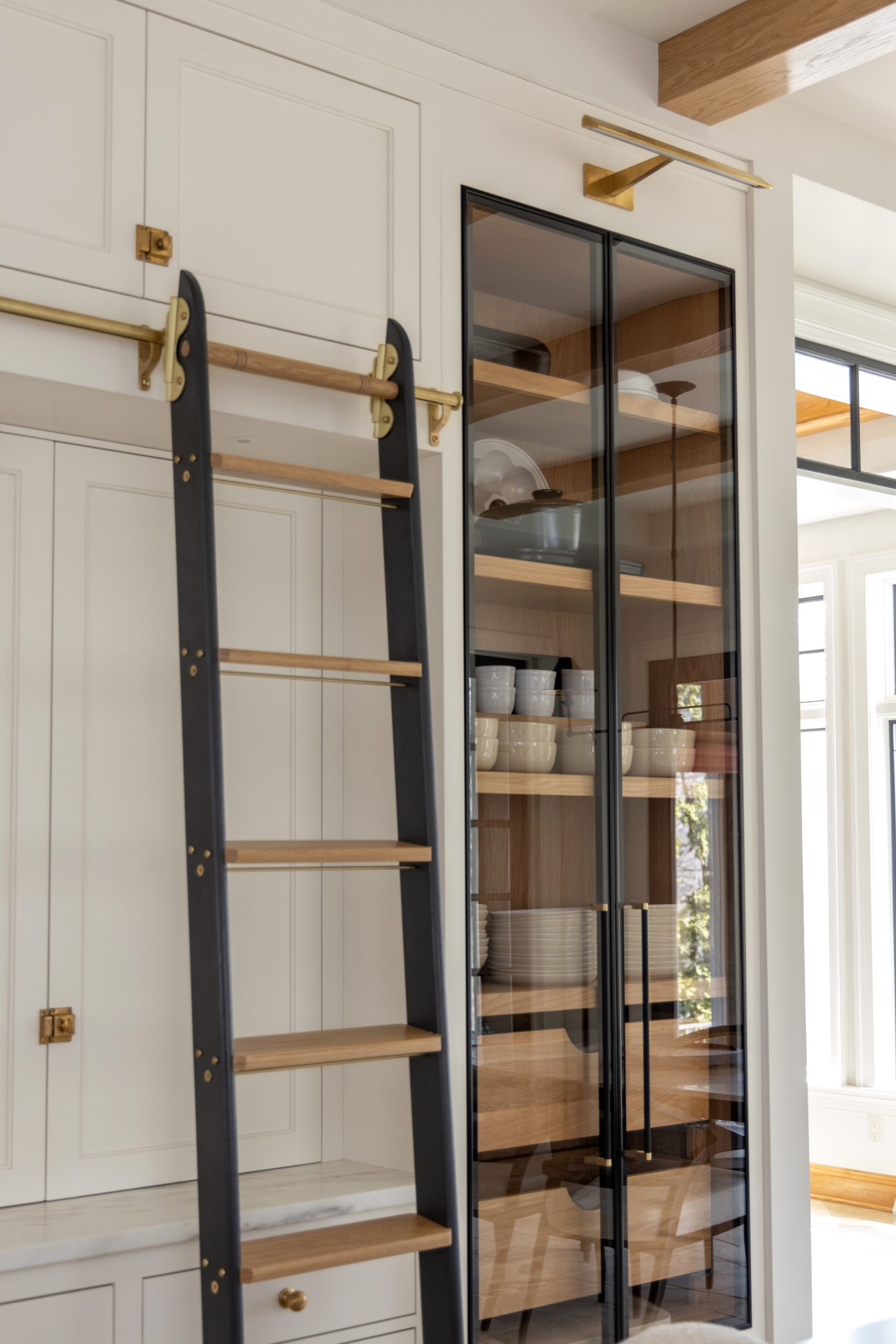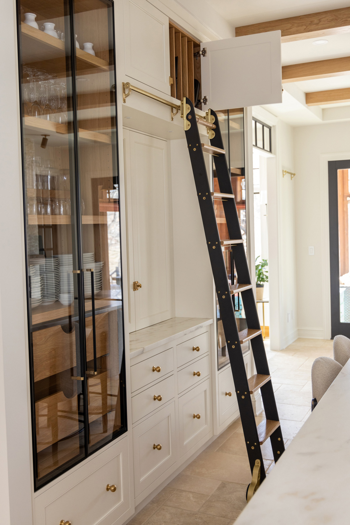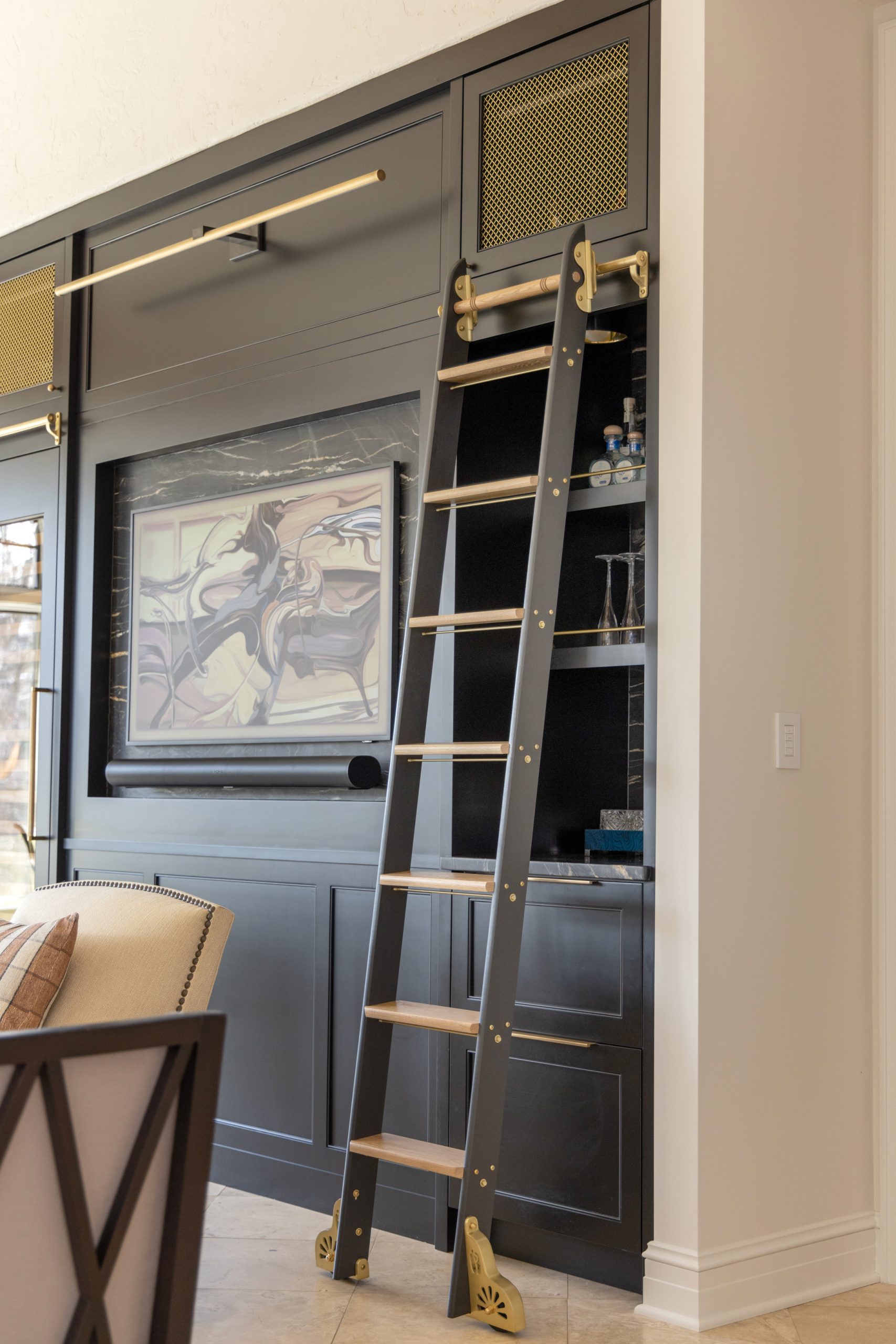 Because the ceilings are tall, a last-minute change included the addition of a library ladder that can attach to solid brass railings that match the cabinetry hardware used in the pantry and throughout the kitchen. Including brass rails in the kitchen and on the entertainment center/bar give her the ability to use the ladder in multiple places.