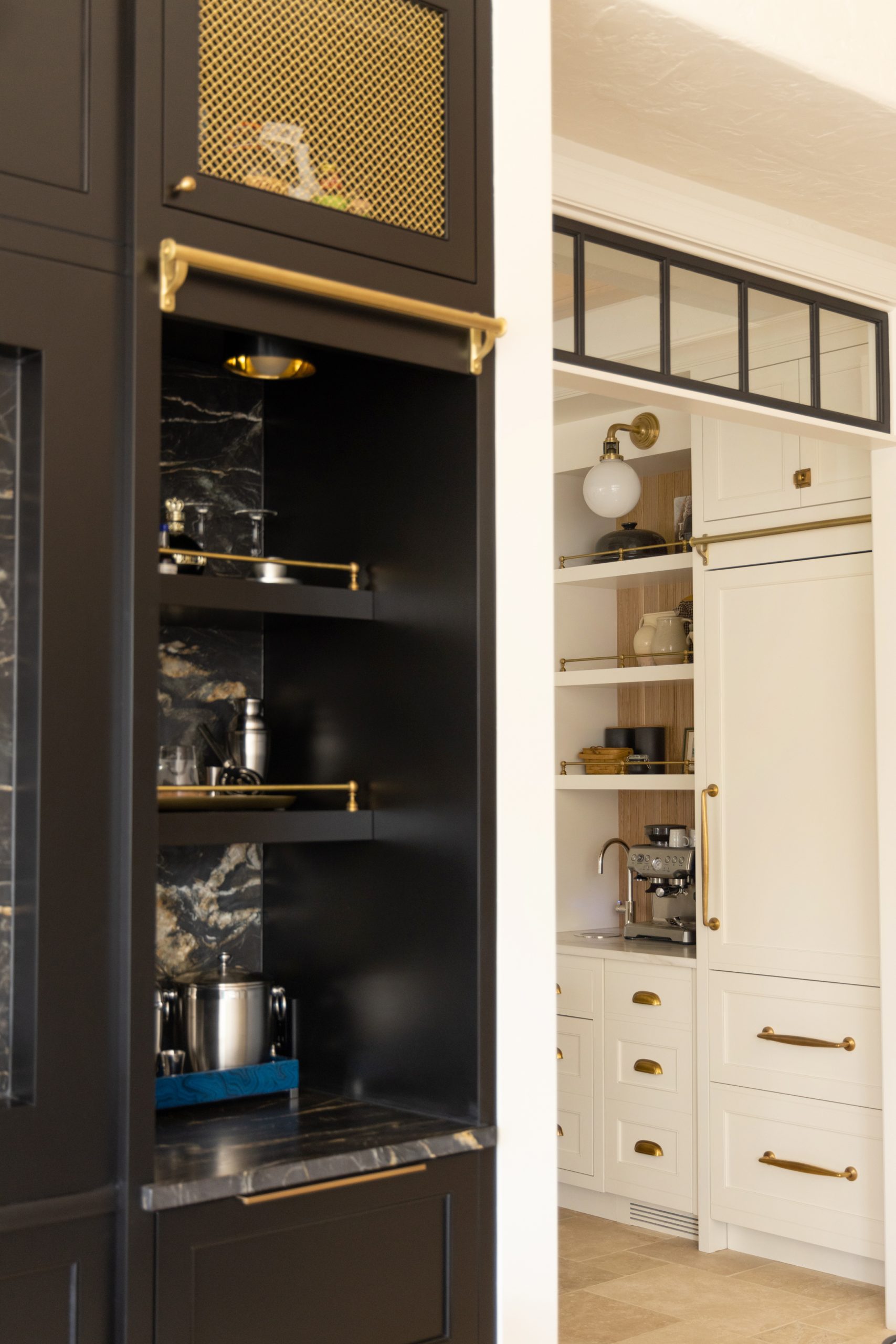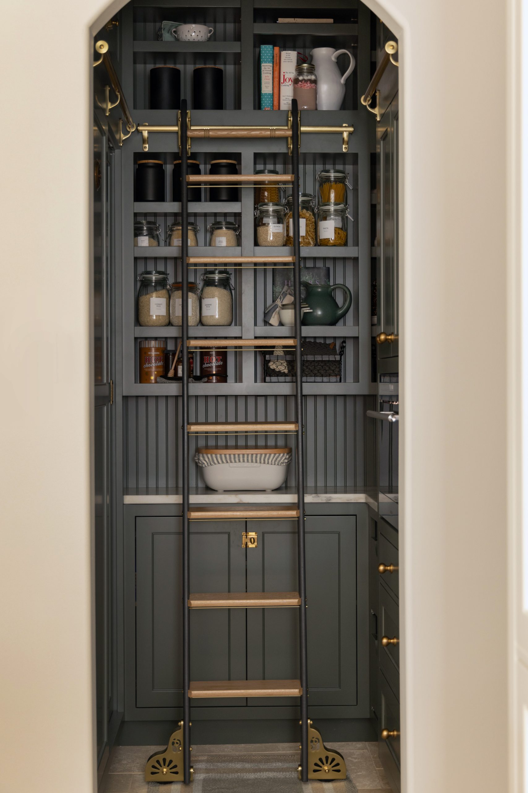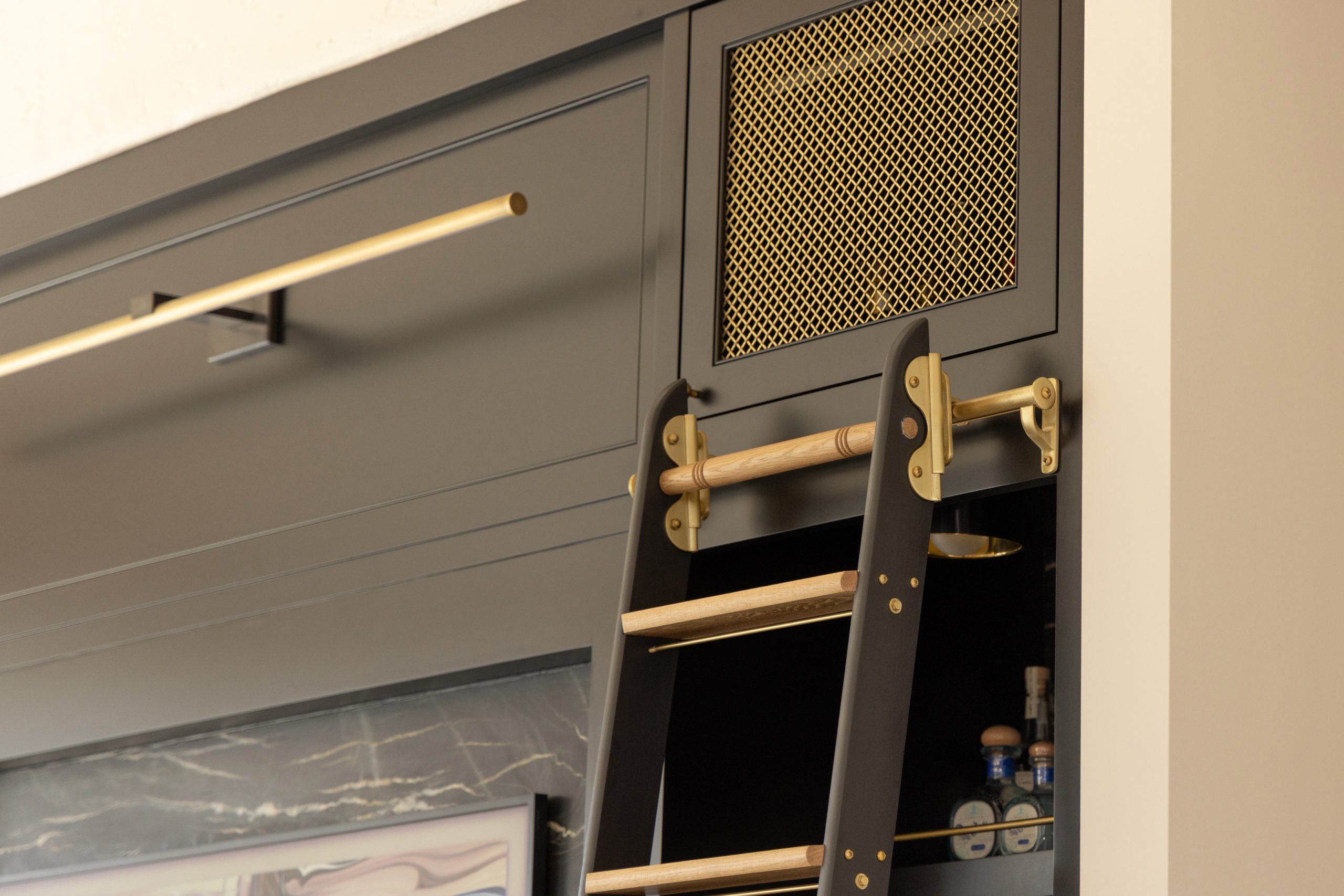 Because the ceilings are tall, a last-minute change included the addition of a library ladder that can attach to solid brass railings that match the cabinetry hardware used in the pantry and throughout the kitchen. Including brass rails in the kitchen and on the entertainment center/bar give her the ability to use the ladder in multiple places.