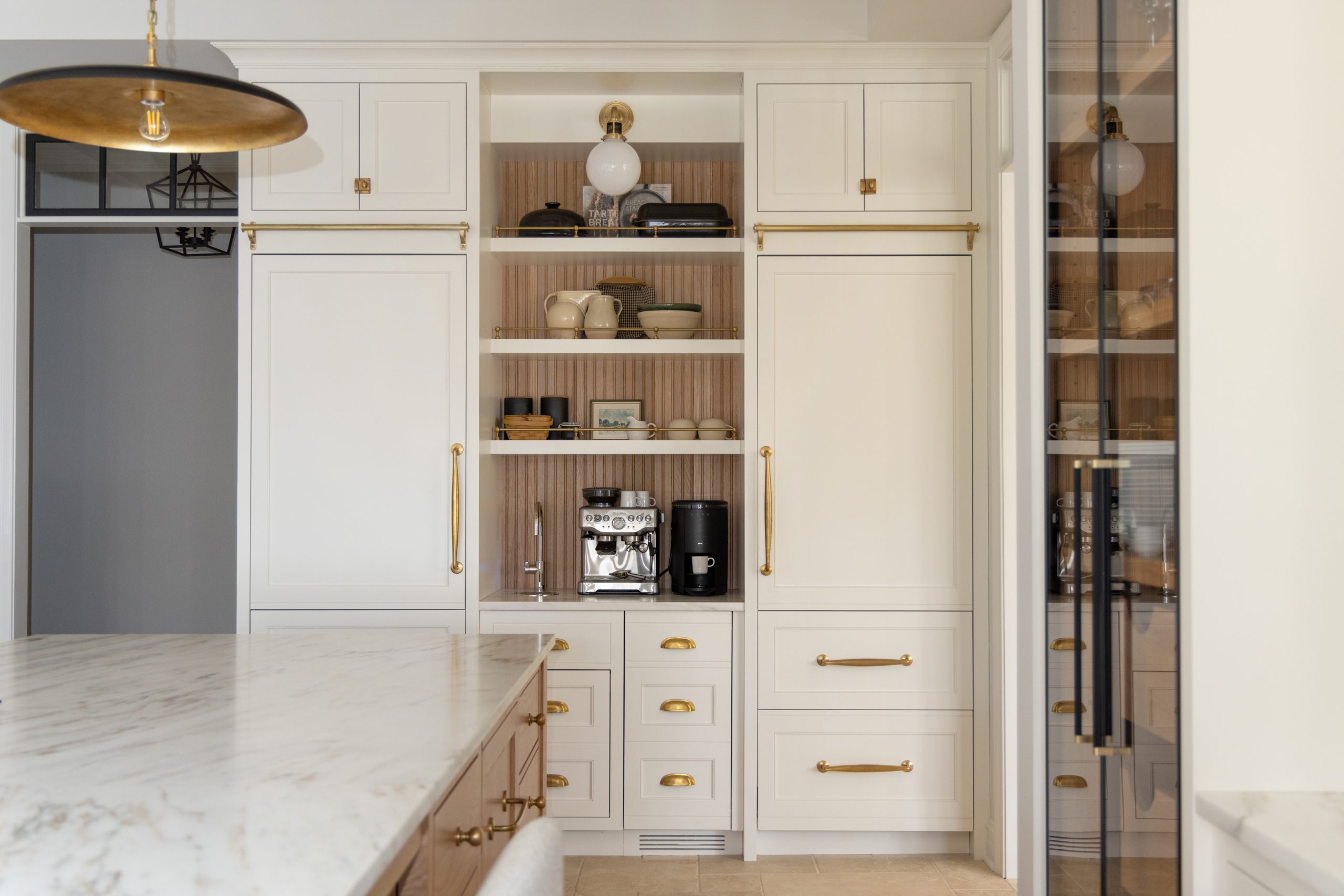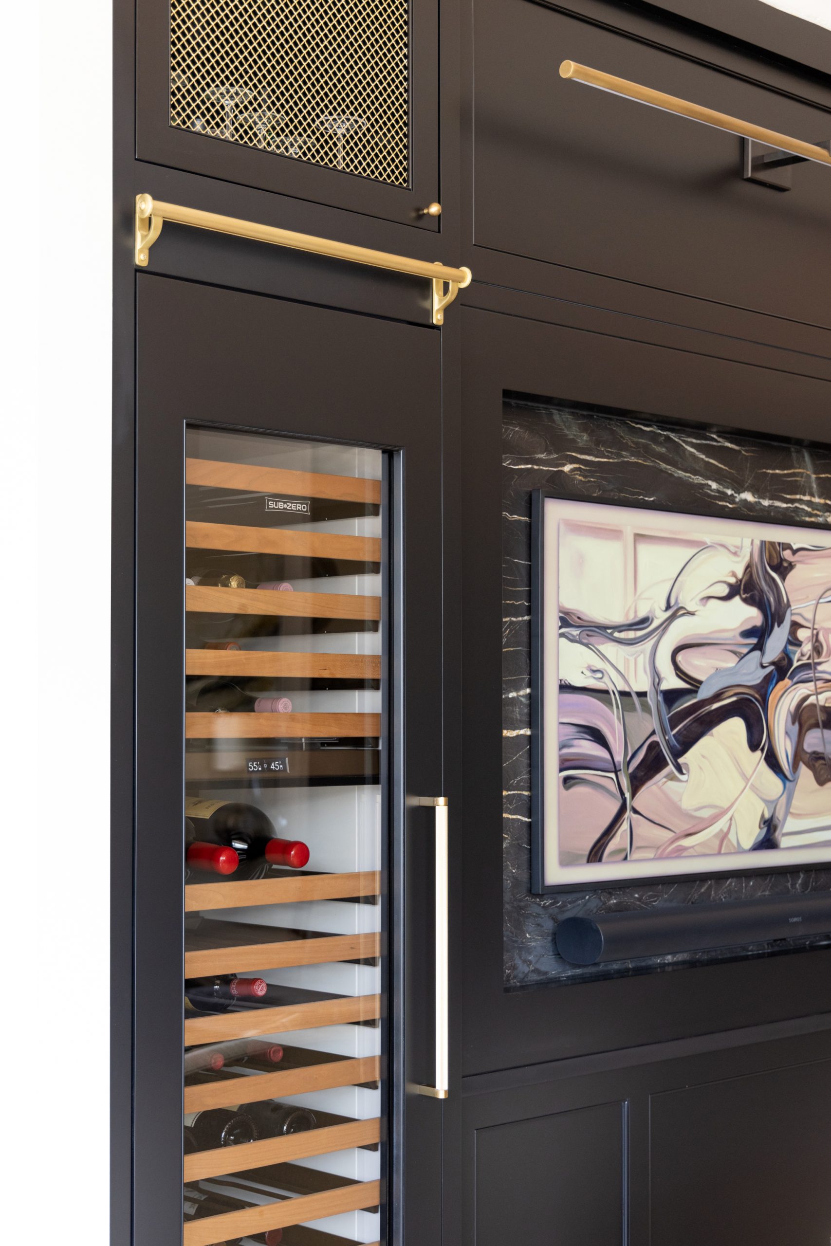 Configuring this entire wall, which is shared with the great room on the backside, proved to be one of the biggest challenges with the renovation. The kitchen side needed to provide adequate storage for the baking center, while the great room side needed to be deep enough to include a paneled column Sub-Zero wine refrigerator and paneled refrigerator drawers in the built-in entertainment center/bar.