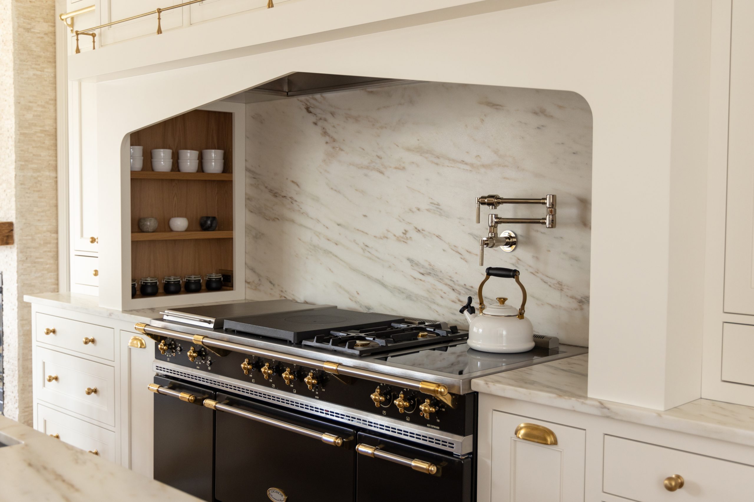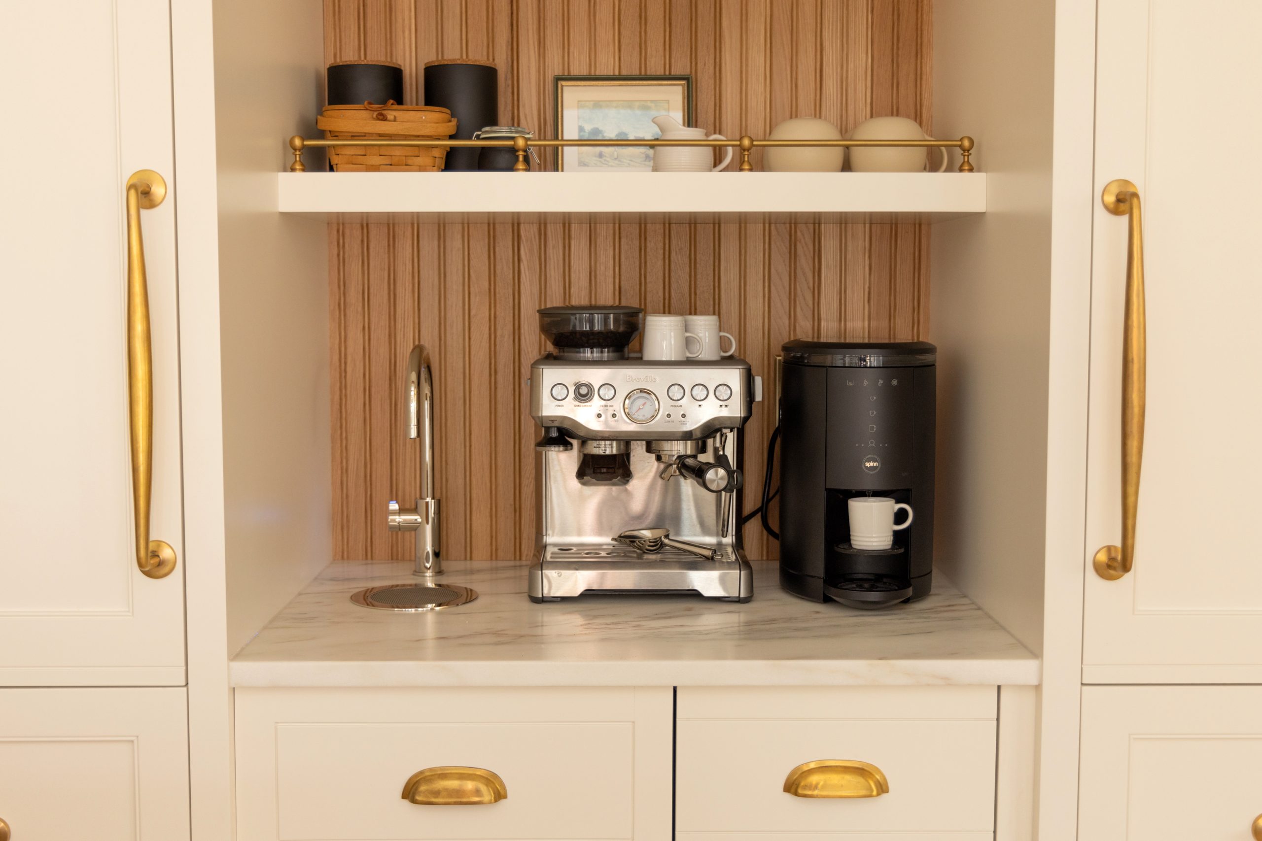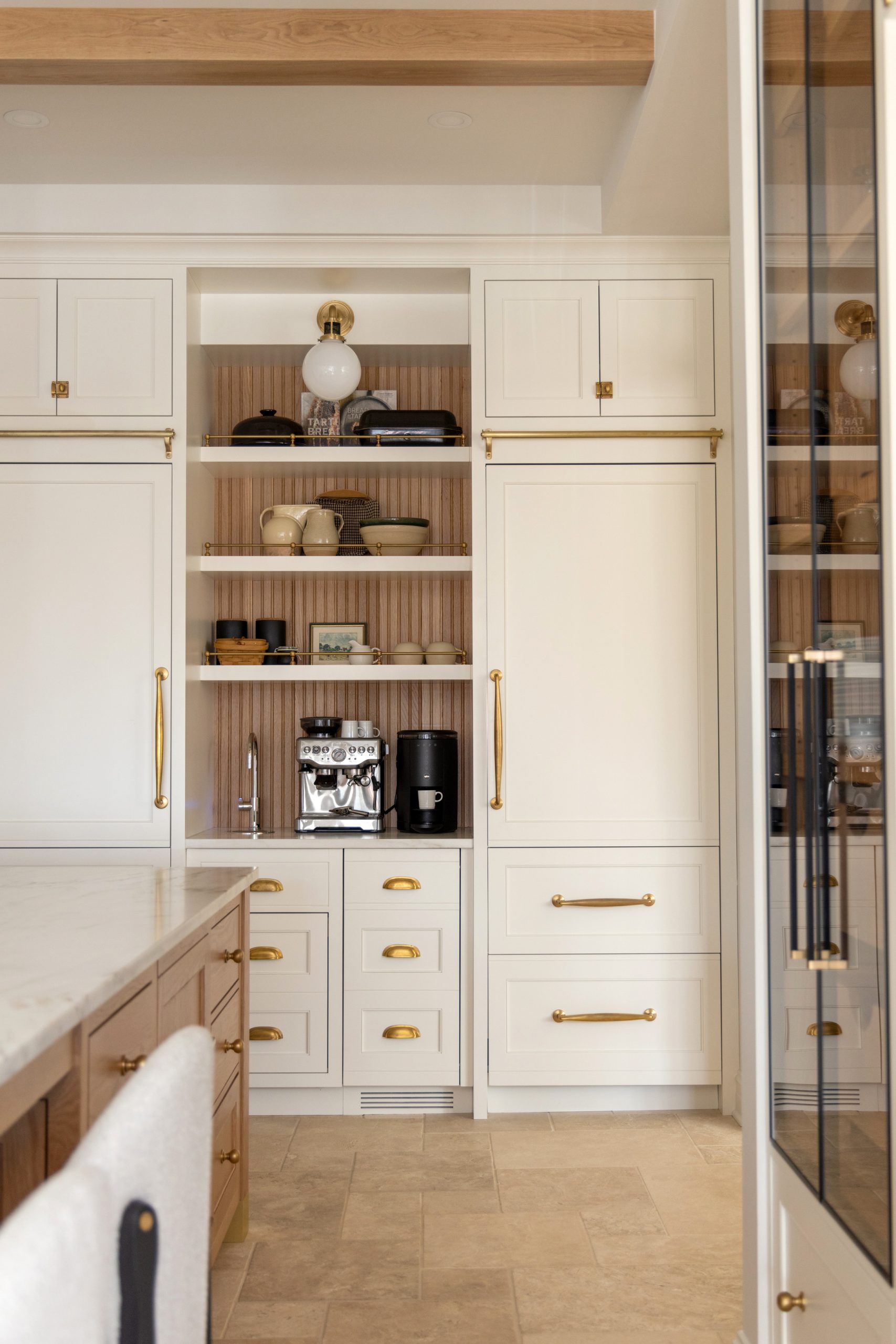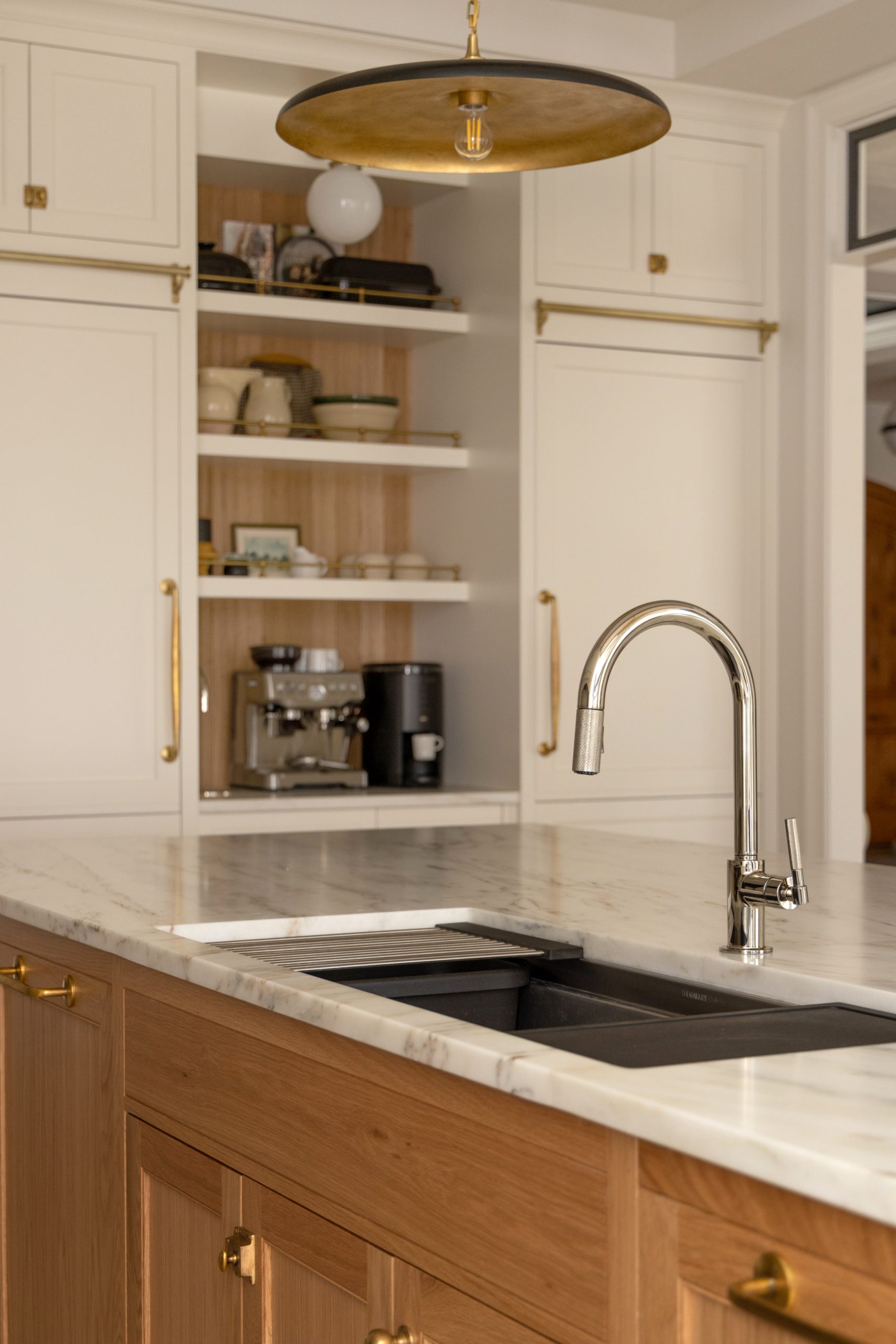 Oak is also used prevalently as accents around the perimeter. Notably, it serves as a backdrop for the niches that are recessed into the walls on each side of the Lacanche range that is accented with a slab marble backsplash and a Brizo pot filler. Oak tongue and groove beadboard, installed vertically, contrasts against white shelves in the beverage center, which includes a coffee machine with a dedicated water line, an espresso machine and a Zip Water HydroTap for boiling, cold and sparkling beverages. This wall also includes a paneled Sub-Zero refrigerator and freezer and a Scotsman ice maker, paneled to look like a trio of drawers.