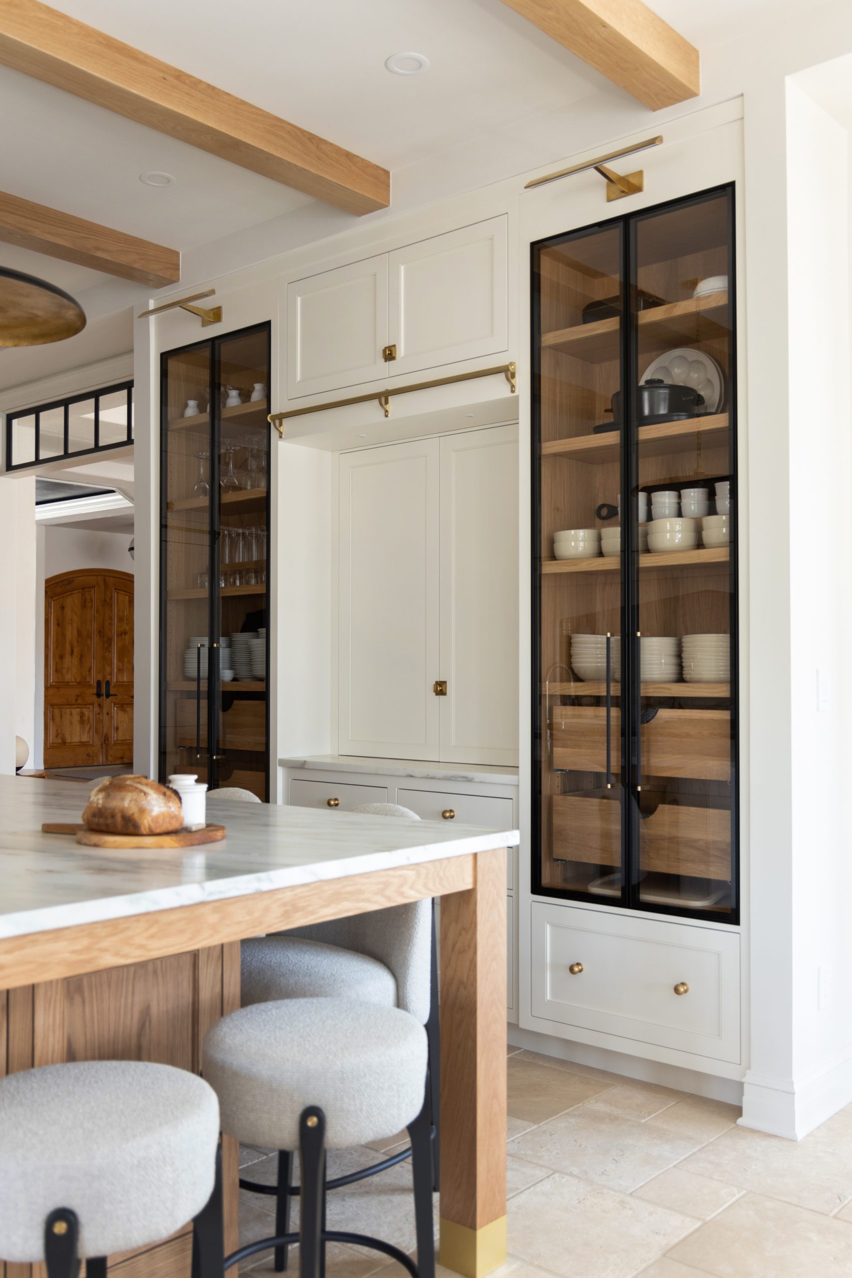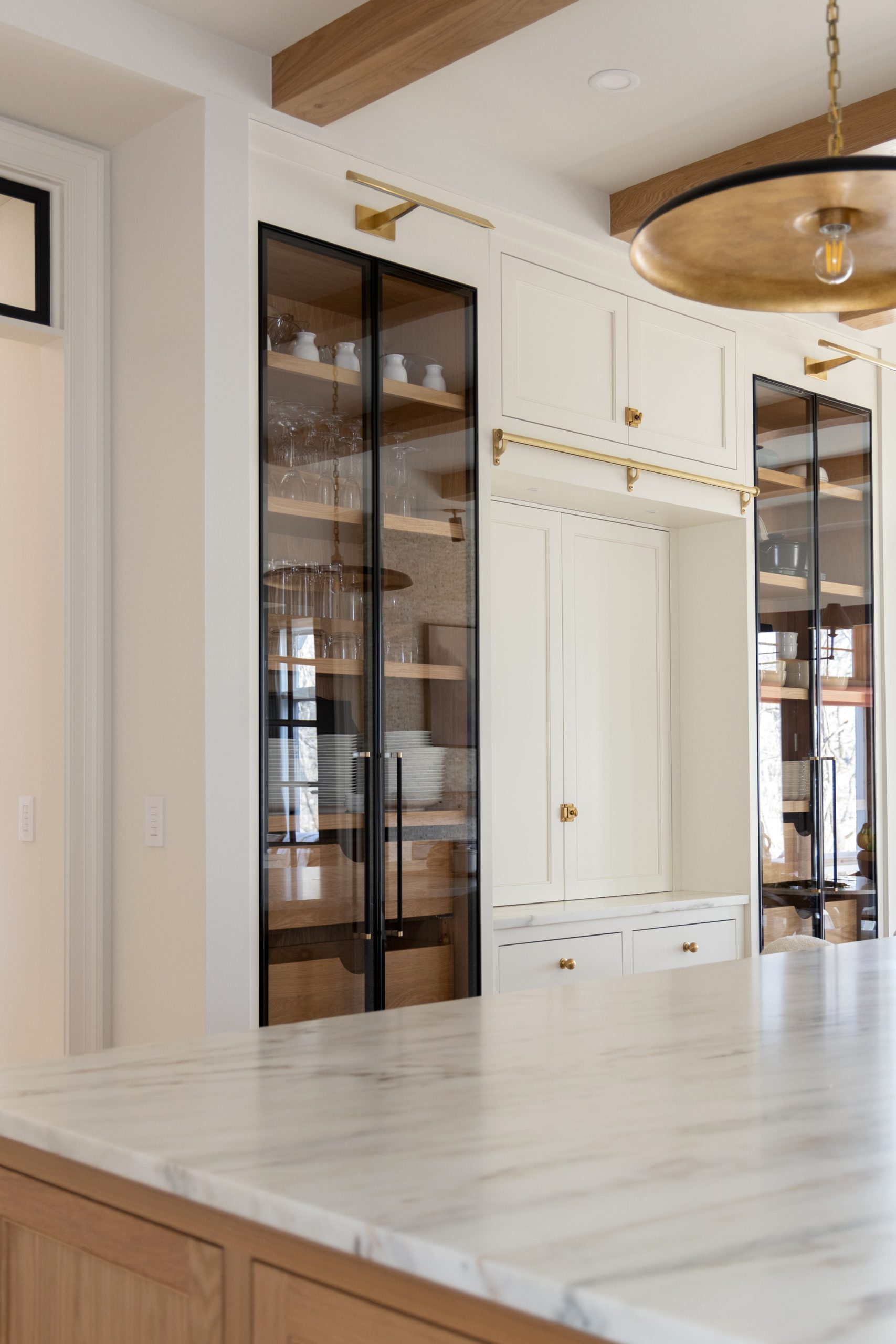 The glass doors are framed with black metal that matches the window trim and the exterior doors in the rest of the home. Expanding the opening between the kitchen and great room gave Benton the perfect canvas for adding a black-trimmed transom window that allows more natural light to flow into the kitchen from the great room.