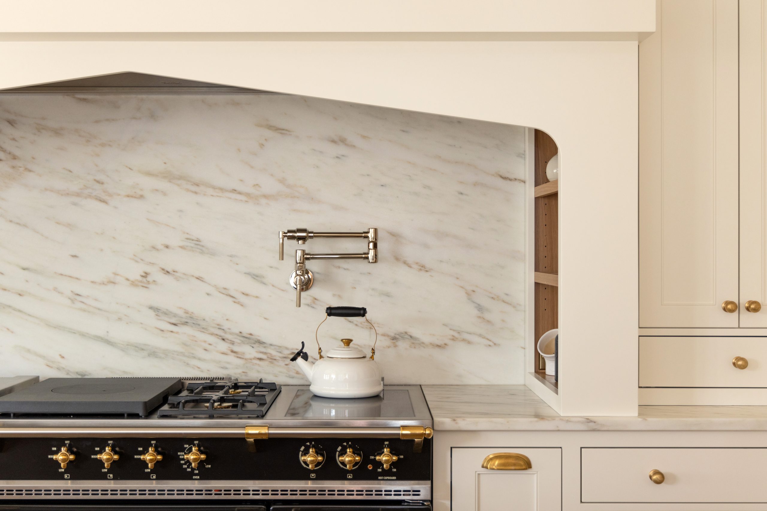 While they were mindful of resale value and making sure any renovations would appeal to all home buyers, they did have their own aesthetic and functional goals, which included modernizing the space with a timeless and classic look that matched the traditional elements of the rest of the home. As well, to reduce the overall renovation budget, they decided to keep the existing travertine floor, which would have been costly to replace since it ran throughout the entire main floor.
