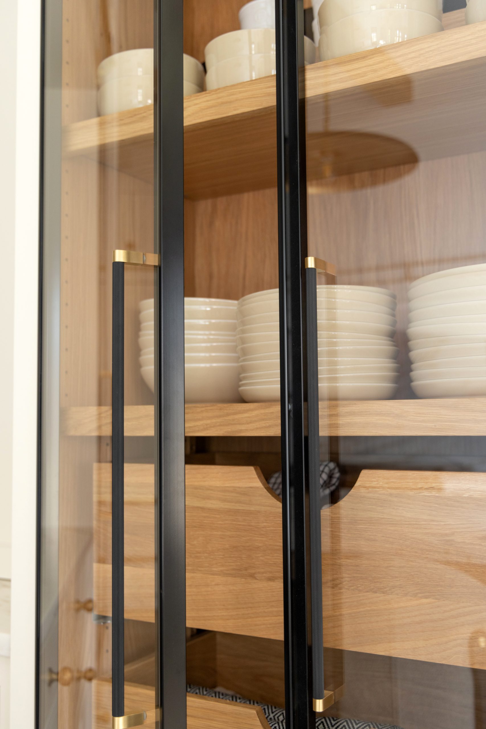 On the wall opposite of the range, oak has a focal-point moment where shelves and drawers are visible through tall, custom glass doors that offer a visual of dishes and glassware precisely stacked by the homeowner.