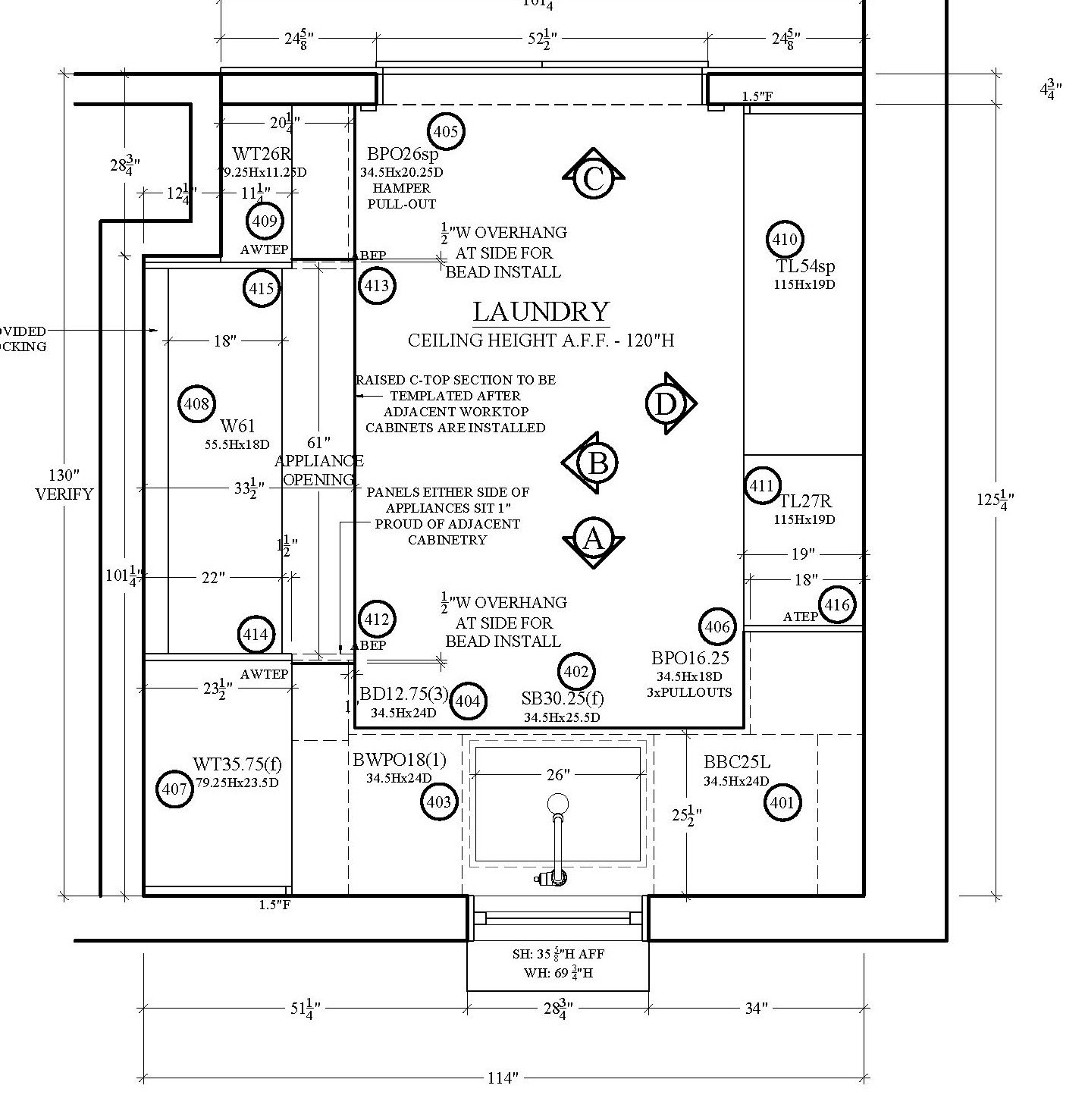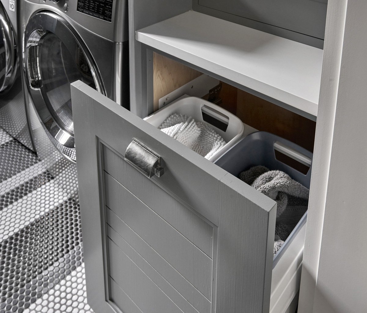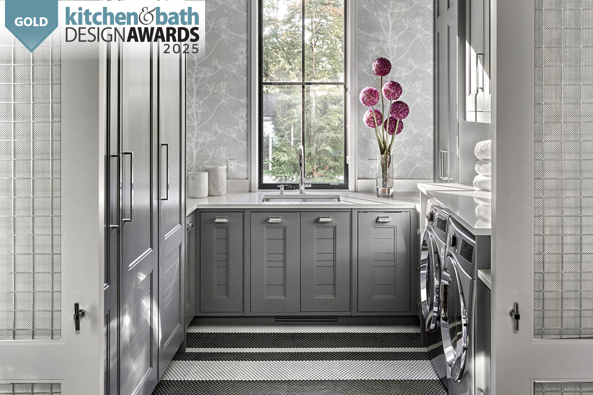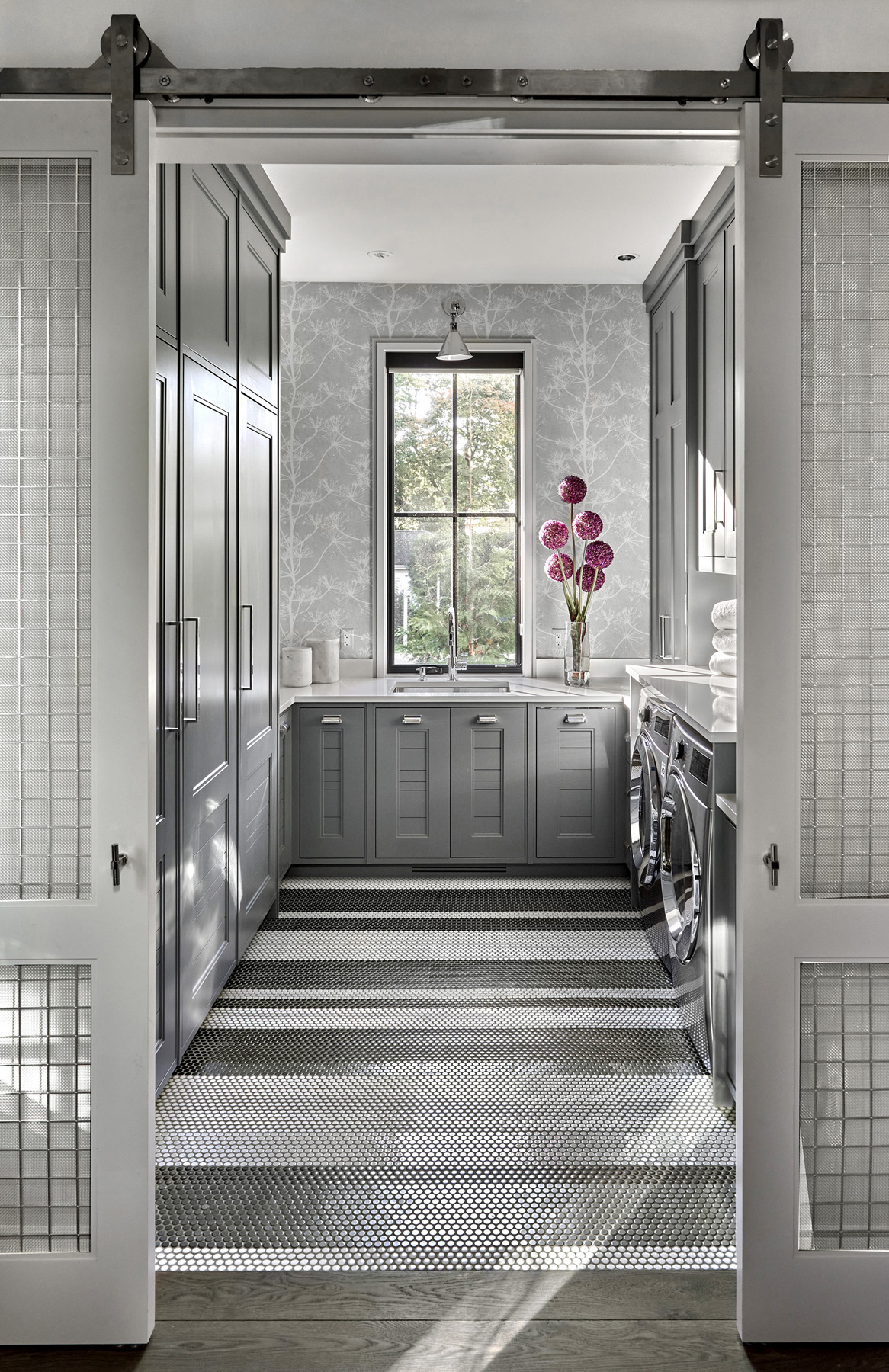 Careful space planning divided the small, 110-sq.-ft. room into two highly efficient zones: a mudroom on the left with generous storage for coats, shoes and sports gear, and a laundry area on the right featuring hamper pullouts, sorting bins, and durable Pure White quartz countertop from Caesarstone for folding and prep. In addition to the quartz surfacing, the team selected other resilient, high-end materials such as custom cabinetry and a striped penny round floor tile from Ann Sacks in a custom pattern – all chosen to withstand daily wear while maintaining visual appeal.