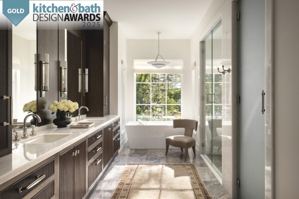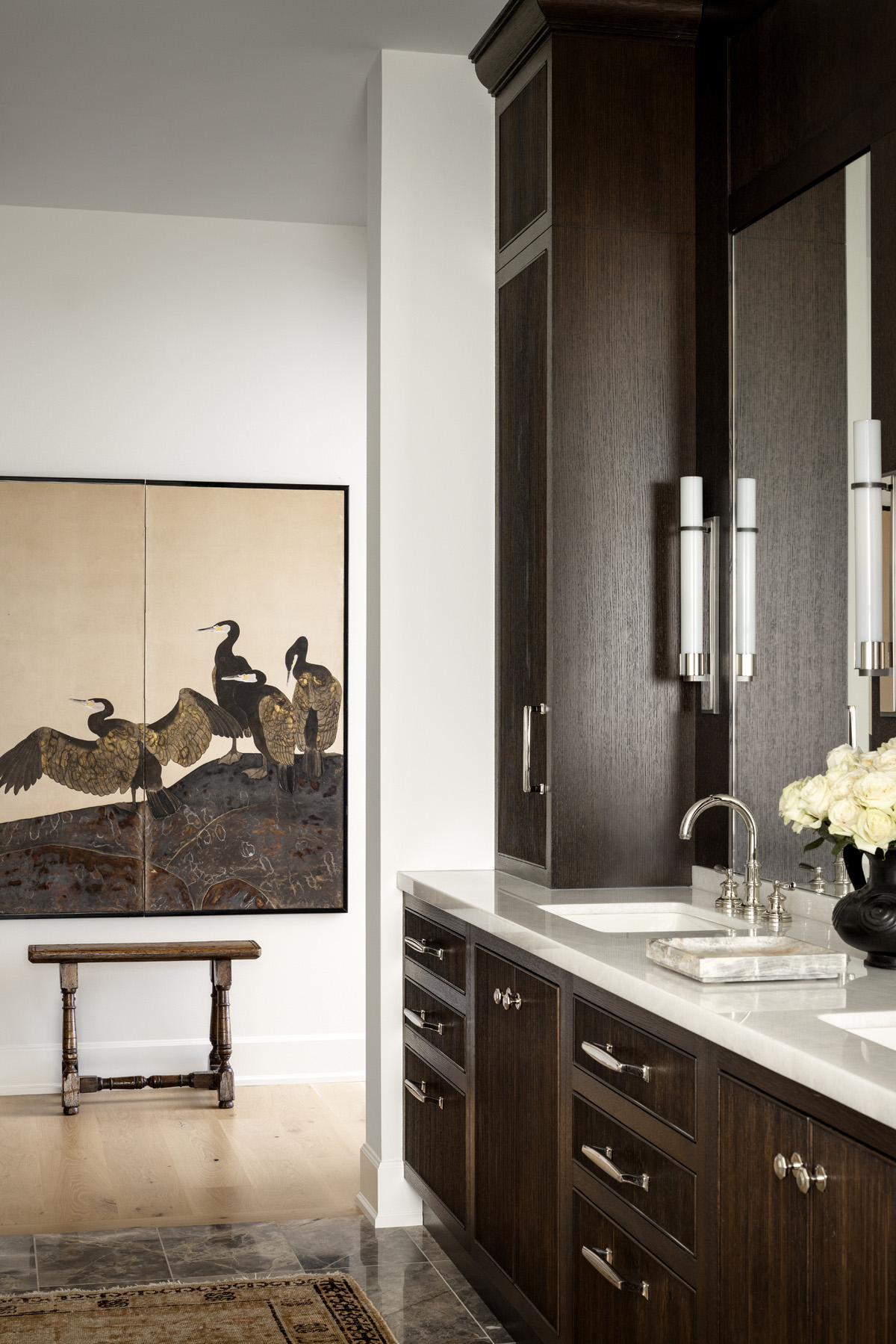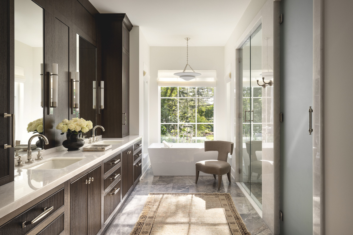 To contrast the darker custom cabinetry with reeded doors, the designers selected elegant Frank Allart hardware along with lighter-toned wall finishes, natural stone and Fior Di Bosco 12″x24″ High Honed tile and Bianco Dolomiti Select 12″x24″ tile from Artistic Tile.