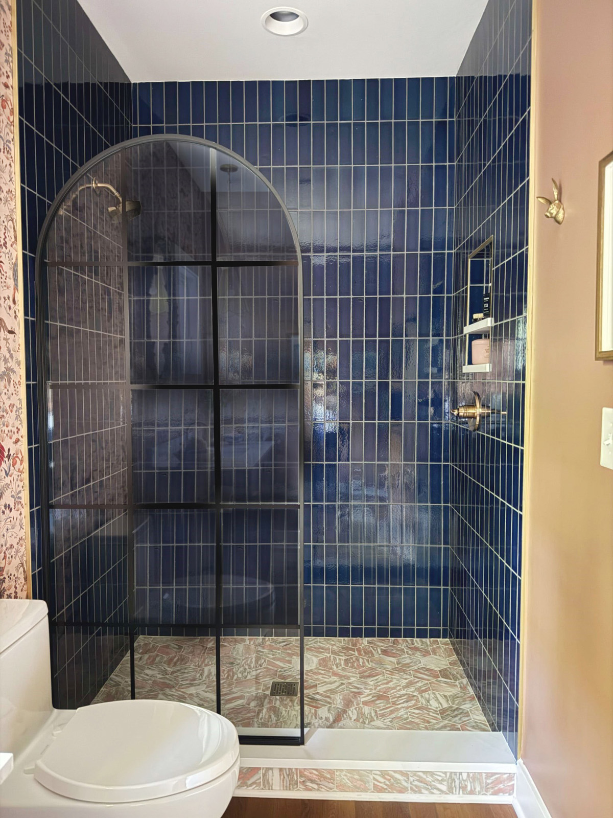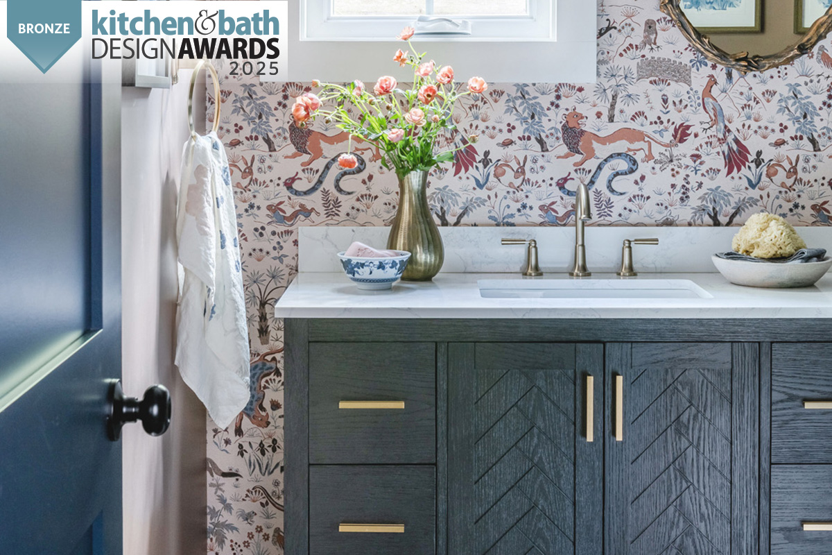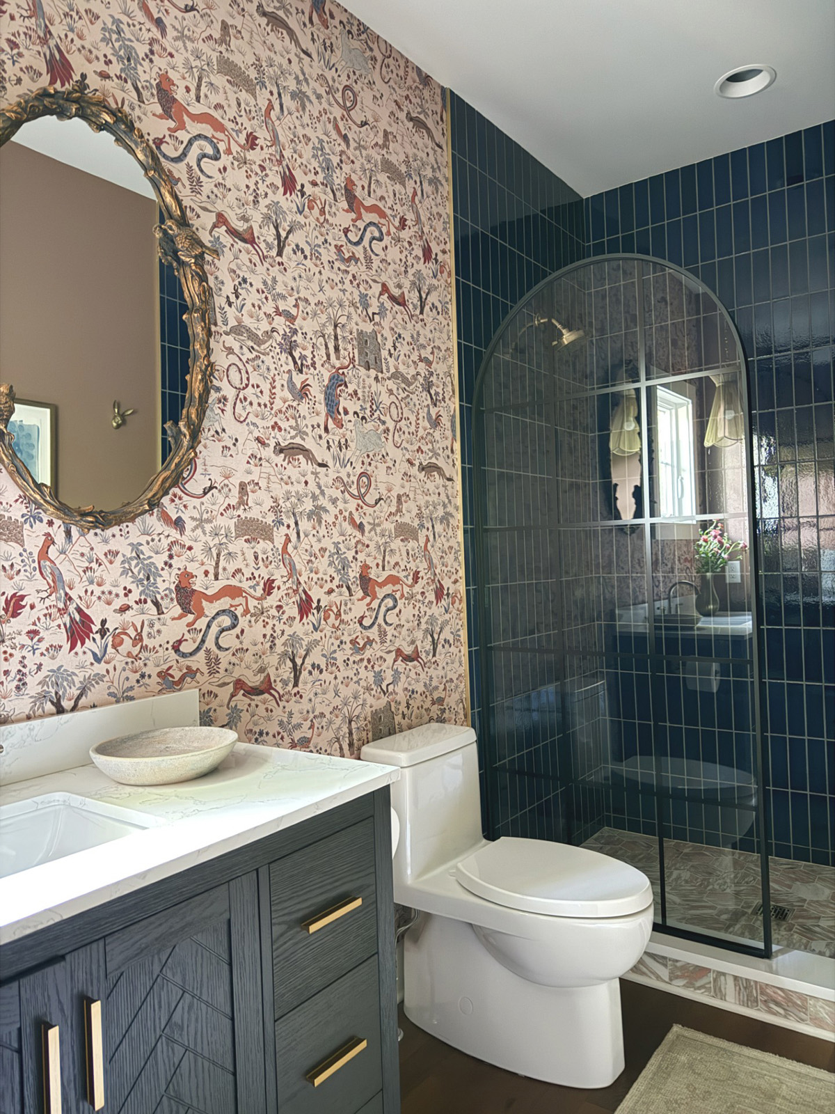The homeowners went all in with color and texture. From the pendant lamp to the bird sculpture mirror to the lion-filled wallpaper, there is interest in every view. Rich-toned Blue Jean lava stone wall tile from Color One and Riad Tile in Norwegian Rose Marble on the shower floor are highlighted by an elegantly arched black-trimmed glass door. A white Kohler toilet and Saylor faucet and shower from Delta Faucet in Champagne Bronze complete the cottage-cozy room.