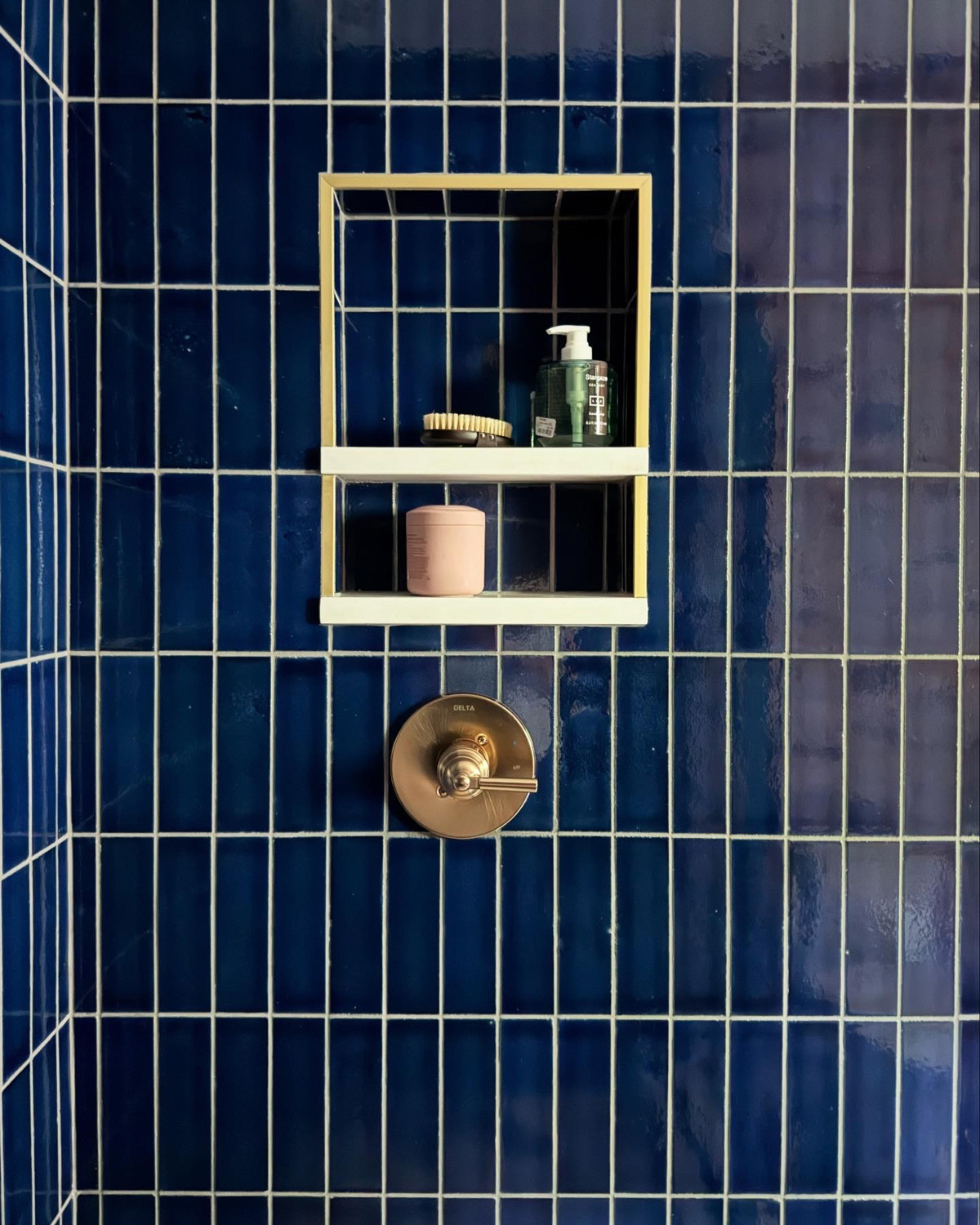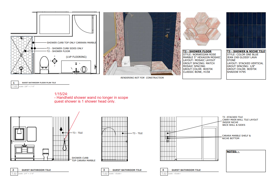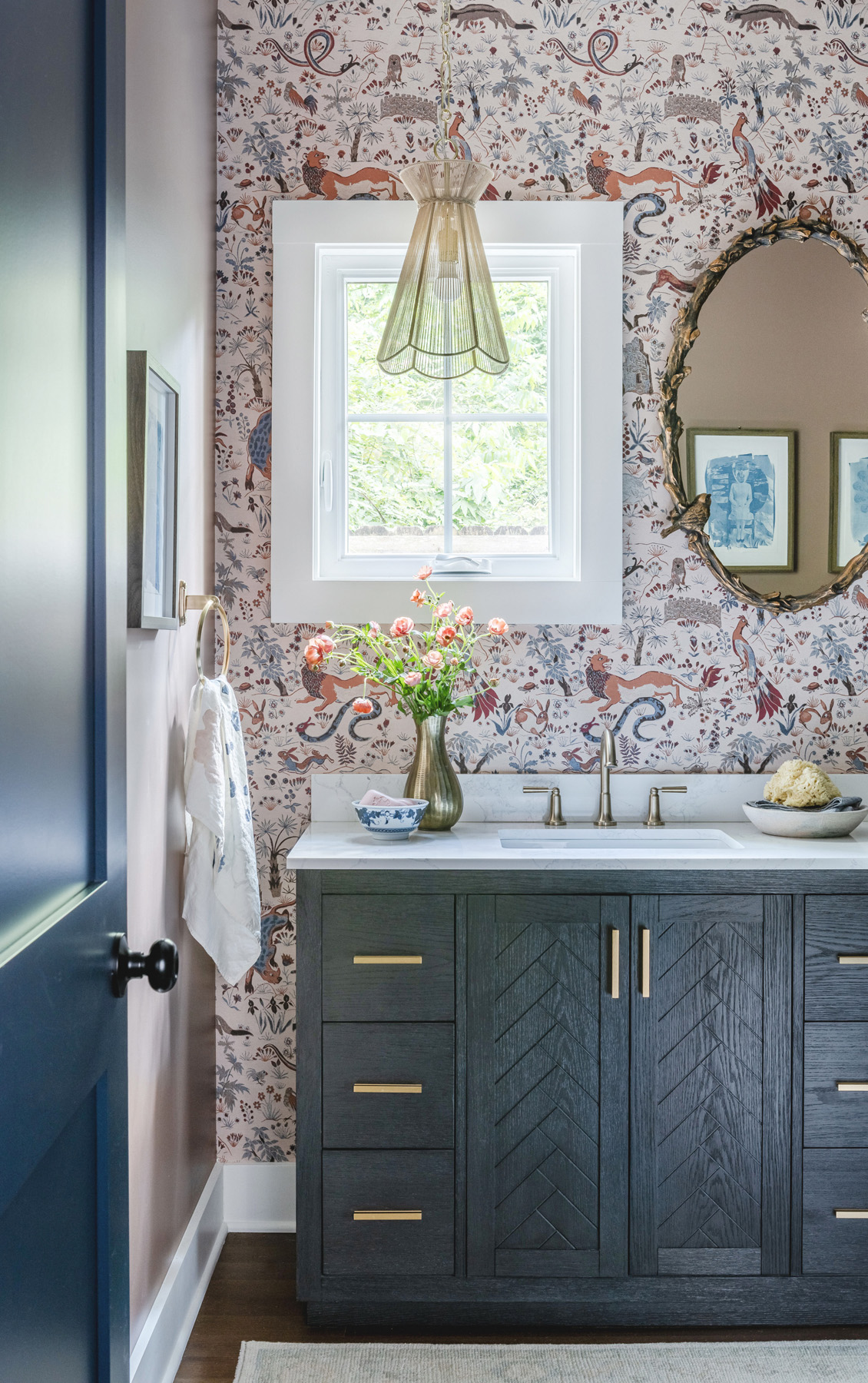 The homeowners went all in with color and texture. From the pendant lamp to the bird sculpture mirror to the lion-filled wallpaper, there is interest in every view. Rich-toned Blue Jean lava stone wall tile from Color One and Riad Tile in Norwegian Rose Marble on the shower floor are highlighted by an elegantly arched black-trimmed glass door. A white Kohler toilet and Saylor faucet and shower from Delta Faucet in Champagne Bronze complete the cottage-cozy room.
