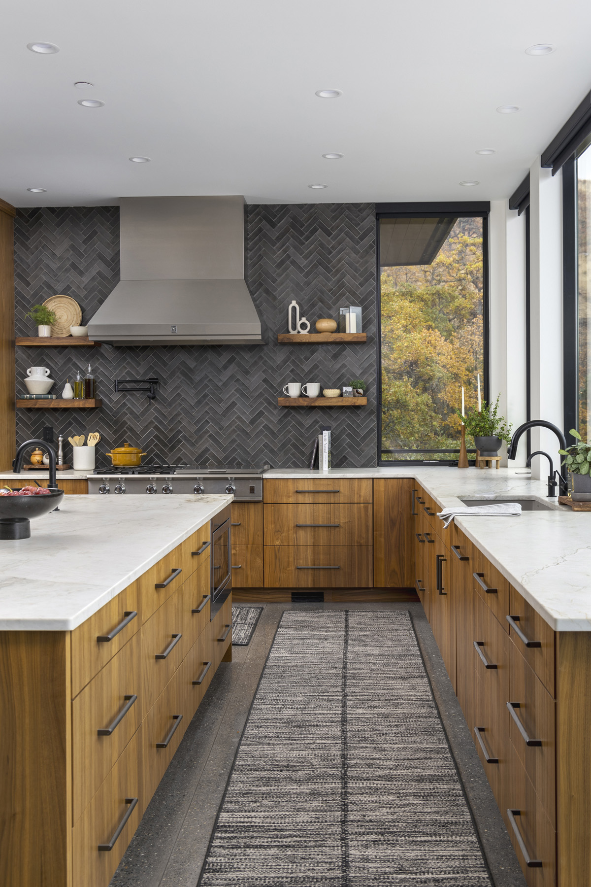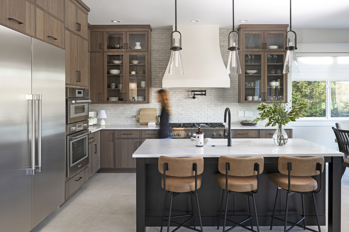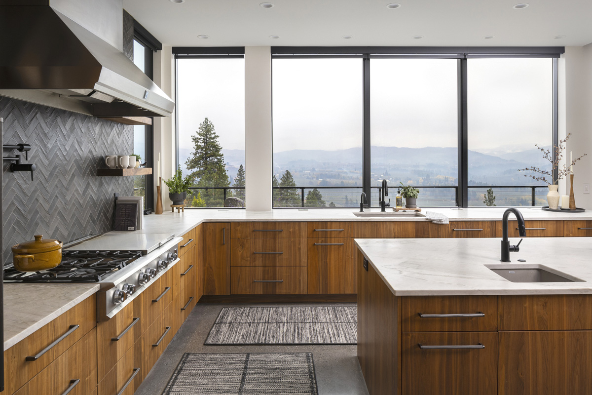 “This kitchen has enough square footage that we could include more base cabinets, including two islands, and eliminate most of the upper cabinets,” she says, noting a collaboration with Allen’s Fine Woodworking and Gorge Design Build. “There are a few wall cabinets around the refrigerator and double ovens, and we included some floating shelves around the range hood, but the kitchen is very open with a lot of windows.”