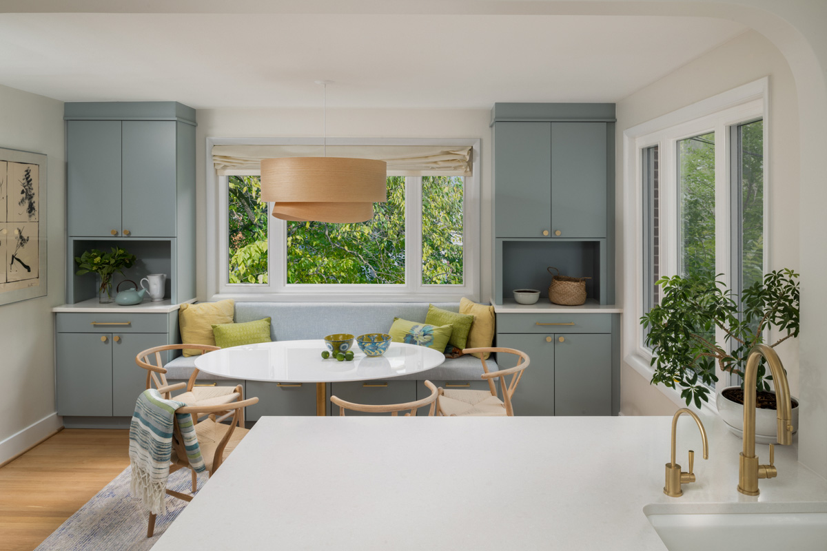 Stepping further into the dining room, Emerson included two additional tall pantries, one to each side of a window with a custom bench seat below. One pantry serves as a dedicated coffee/tea station while the other serves as overflow storage for canned goods. As well, the designer included storage in the bench seat.