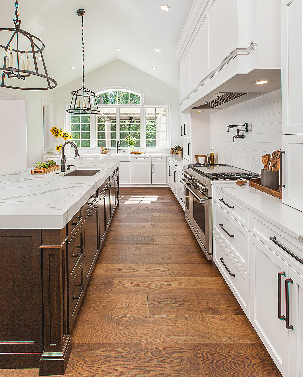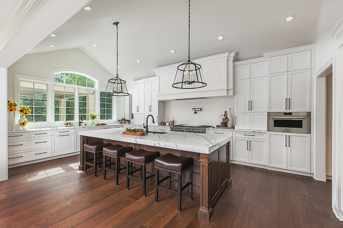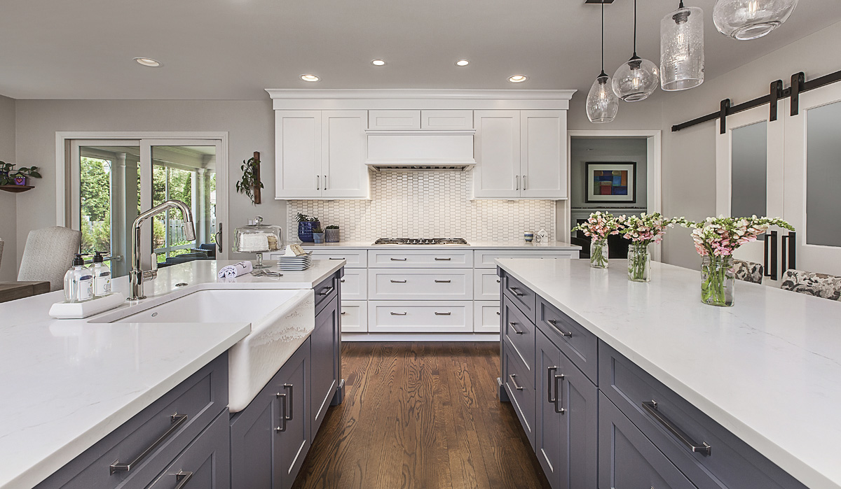 One of Christine Ramaekers’ favorite storage elements is a walk-in pantry. In this kitchen, it is tucked behind sliding barn doors and is complemented with abundant storage options in two islands, one dedicated to food prep and cleanup, the other to family snacking, homework, entertaining and relaxation.