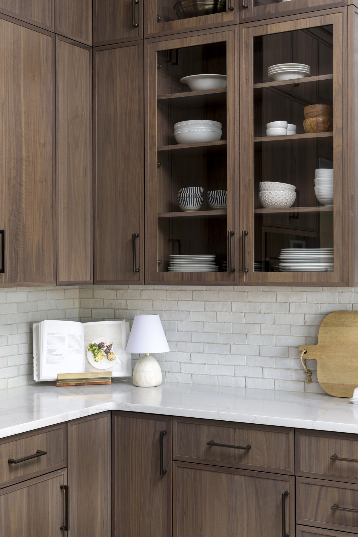 “The previous kitchen was very dark,” she notes. “The glass doors help to lighten the space, while creating some interest.”
