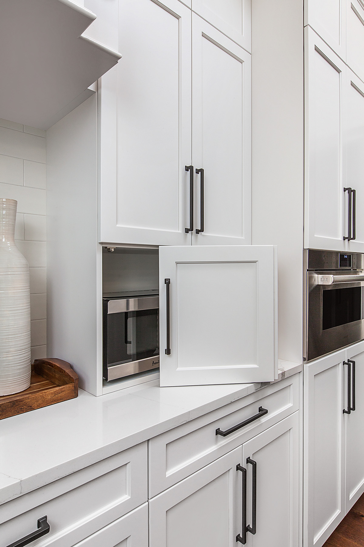 “Our clients still want microwaves, but they don’t use them as much as they once did,” she says. “It isn’t as integral as an appliance, so the pantry is a great place to store it.”