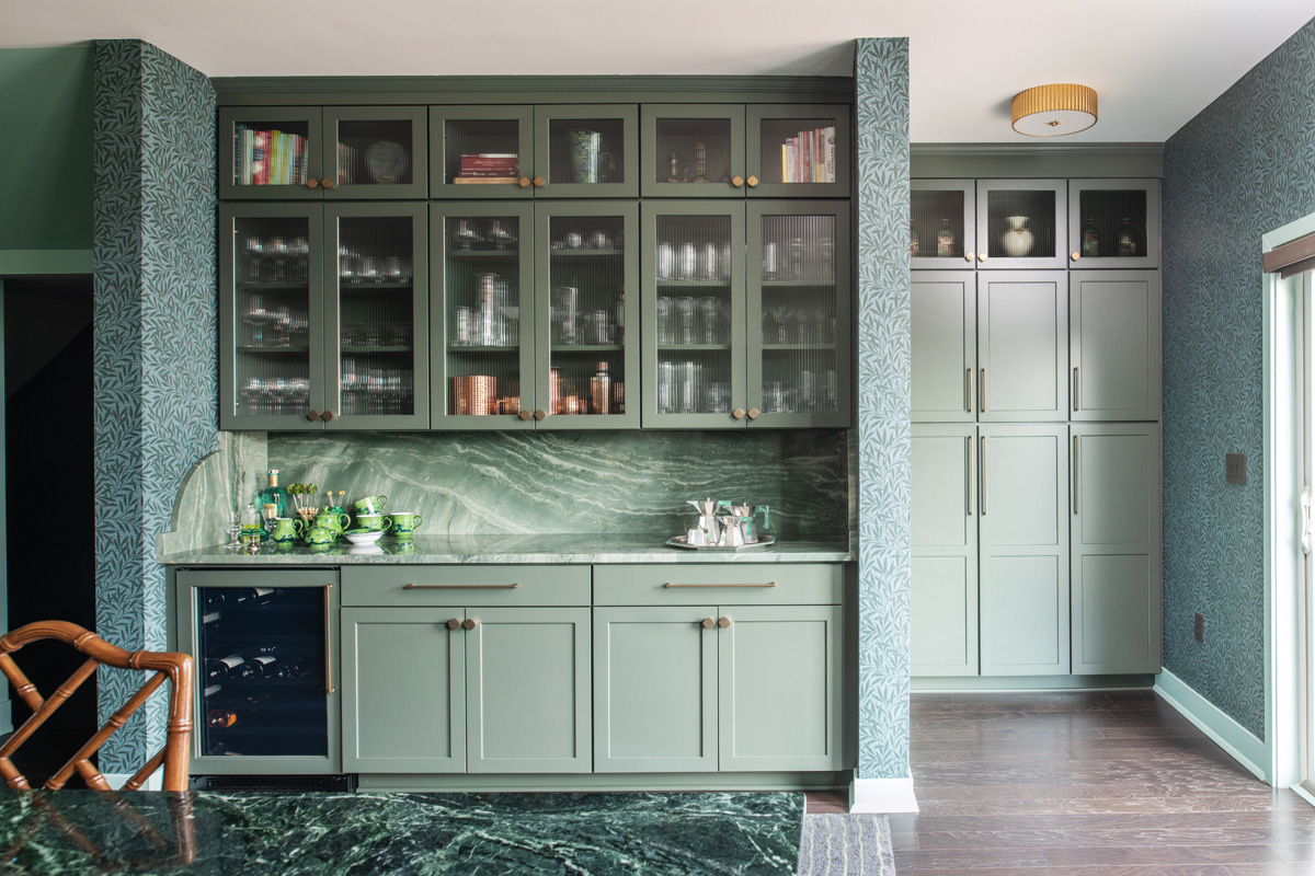 The glass-front bar area and secluded pantry are finished in a darker green to set them apart from the main kitchen.