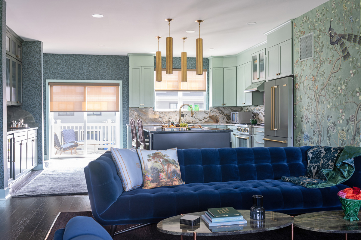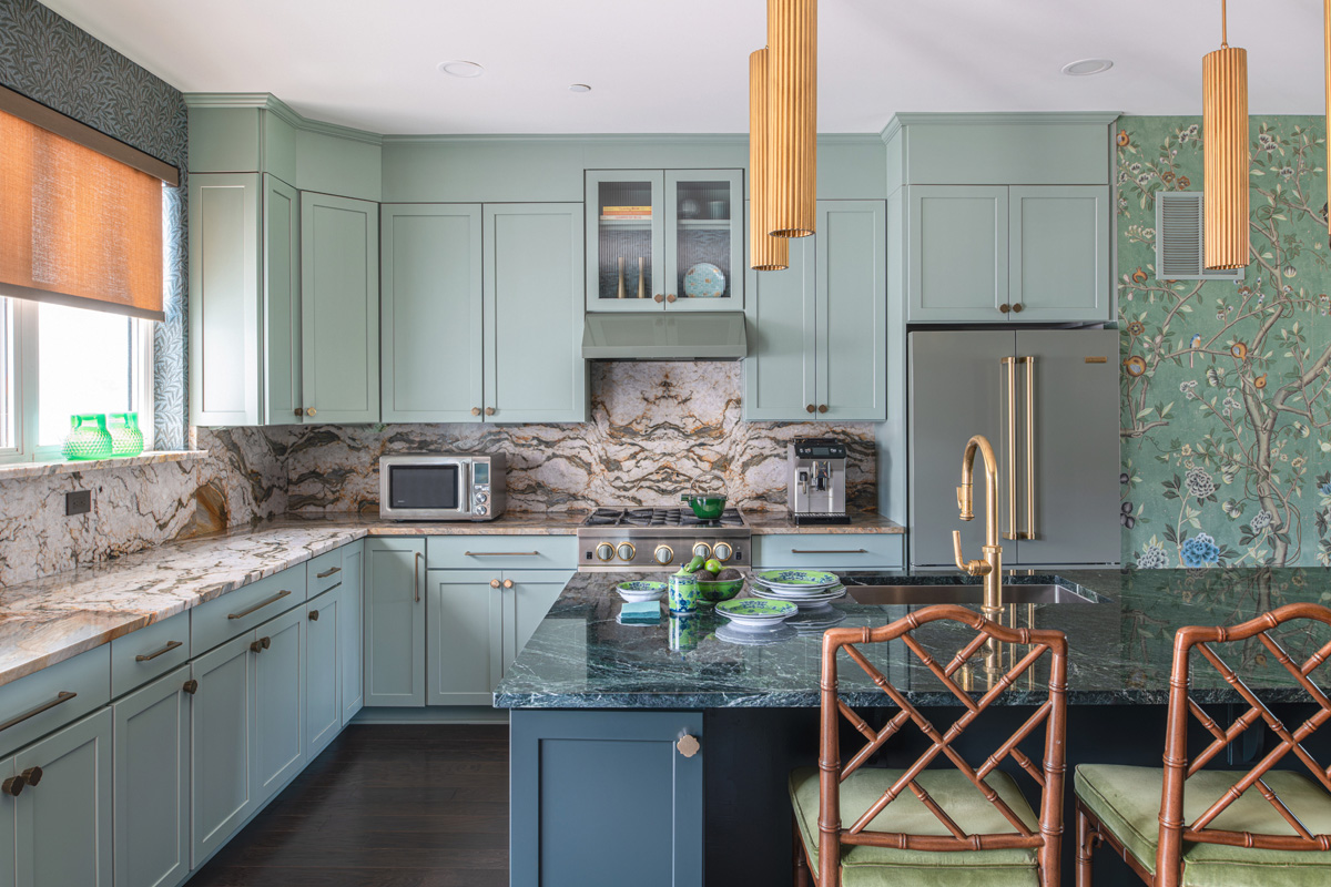 The island features a deep hunter green Vermont Verde slab that provide a bold accent. While the prep side features a sink and brass-toned faucet, the dining side includes Chippendale bamboo counter stools from Artistic Frame that tie in to the biophilic-themed Morris & Co. Emery’s Wllow and DeGournay wallpaper that surrounds the kitchen.