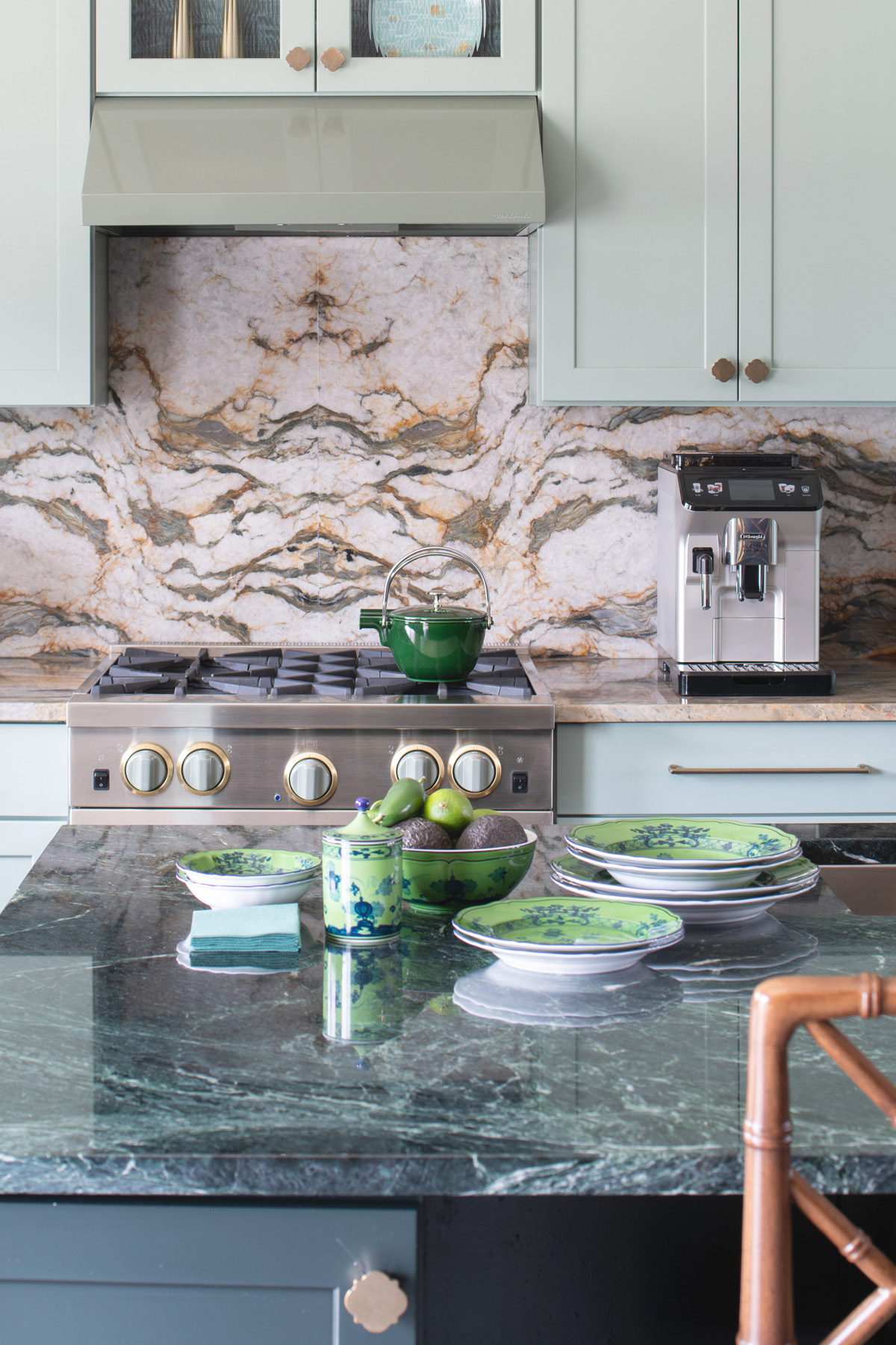 The island features a deep hunter green Vermont Verde slab that correlates with the green tones in the quartzite backsplash.