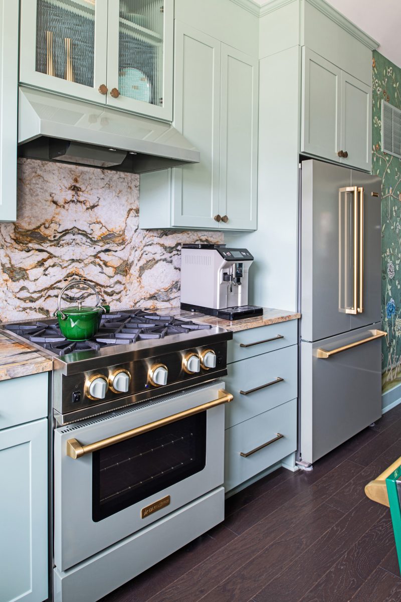 A home cooking enthusiast who likes to entertain, the client requested upscale appliances, which was fulfilled with the incorporation of a Blue Star range and refrigerator in Agate Grey, with custom knobs that tie in with the overall color palette. The kitchen surround and backsplash feature a bookmatched Fusion Crystal quartzite, a dramatic stone that combines fluid swaths of blue, green and gray, interspersed with trailing veins of white.